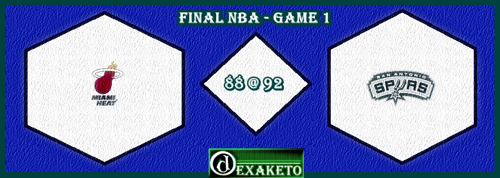 No primeiro jogo da decisão da NBA, Heat, de Allen, James e Wade, domina os três primeiros quartos da partida, mas acaba relaxando no último, o que foi um baita pecado, levando em conta que do outro lado tem Duncan, Parker, Ginobli e outros feras. Spurs vence primeiro duelo, mostra força de reação e deixa a briga mais quente. Será que LeBron não conquistará o Bi? Será que Ginoblli e cia levantarão o troféu da NBA, que o Spurs não conquista desde 2004? Cenas dos próximos 6 jogoos.