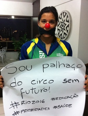 Um dos principais nomes da natação brasileira, Joanna Maranhão usou seu perfil no Instagram para demonstrar apoio às manifestações que vêm tomando conta do país. Nesta quinta-feira, a atleta posou para uma foto usando um nariz de palhaço e com a boca amordaçada por uma faixa preta. Nas mãos, Joanna segurava um cartaz com os dizeres: “sou palhaço do circo sem futuro!”. E ainda escreveu na postagem: