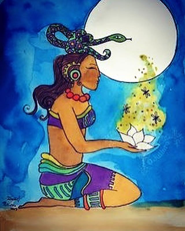 Visualiza-se Ixchel como a Mãe-Lua que mergulha neste tempo e lugar trazendo das estrelas as energias de nossos antepassados.