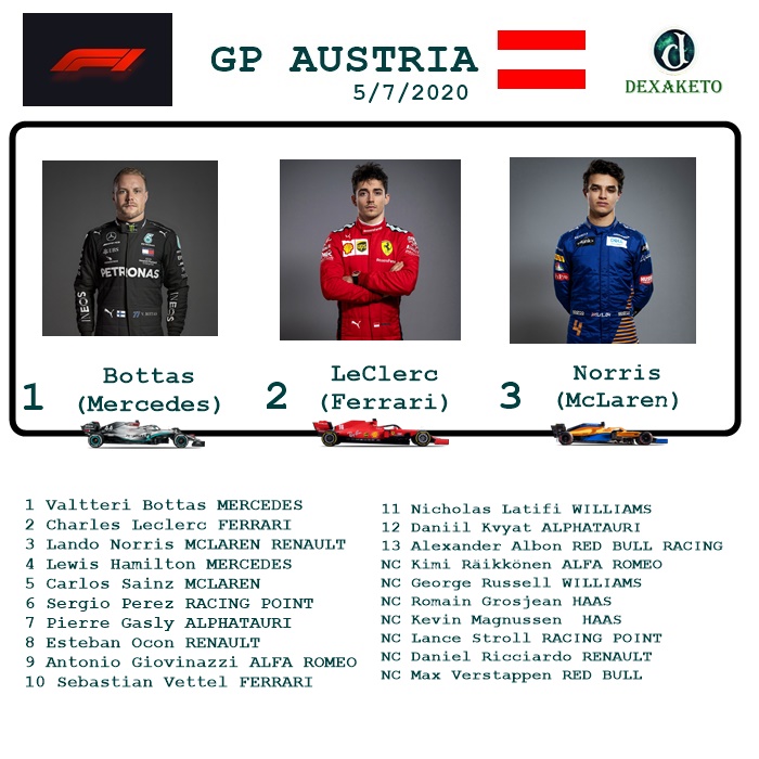Na primeira prova do ano na Fórmula 1 (não iniciada em Março devido à Crise de Covid-19), tivemos uma corrida marcada por quebras e diversos Safety Car. Valteri Bottas conseguiu vencer de ponta à ponta e garantir a primeira vitória do ano para a Mercedes.