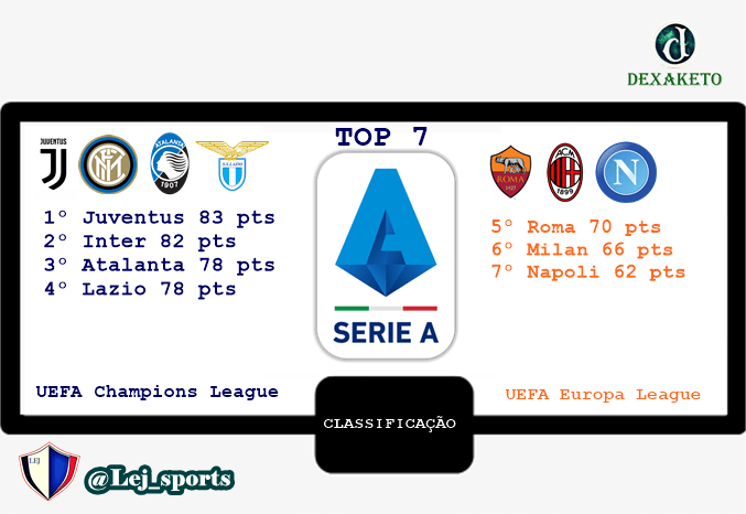 No duelo que valia o vice-campeonato, a Internazionale bateu a Atalanta em Bérgamo e se sagrou vice, apenas 1 ponto atrás da Juventus, é a menor diferença da Juventus para o vice em todos os 9 títulos da Vecchia Segnora. Para a Atalanta, o melhor campeonato de sua história. Para a Inter, aquela sensação de que alguns vacilos, tiraram a chance do time de Milão de disputar mais fortemente o título.