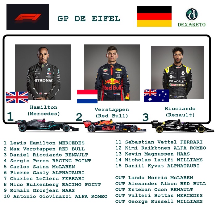 Depois de um início de corrida aonde Bottas fez valer a pole, Hamilton viu o companheiro ter problemas e a corrida cair em seu colo novamente. Depois disso, Hamilton passeou, Verstappen nem sequer apareceu no retrovisor, nem mesmo após o Safety Car. Hamilton seguiu volta à volta, batendo os recordes da pista de Nürburgring. Com essa vitória, Hamilton alcança sua 91ª vitória na carreira e se iguala ao Michael Schumacher como o maior vencedor de corridas da história da Fórmula 1. Além disso, com essa vitória, Hamilton está cada vez mais próximo de seu heptacampeonato mundial, o que faria, ele se tornar o maior campeão da Fórmula 1, junto com Michael Schumacher. A história está sendo reescrita na Fórmula 1! Hamilton, a mais nova lenda da Fórmula 1!