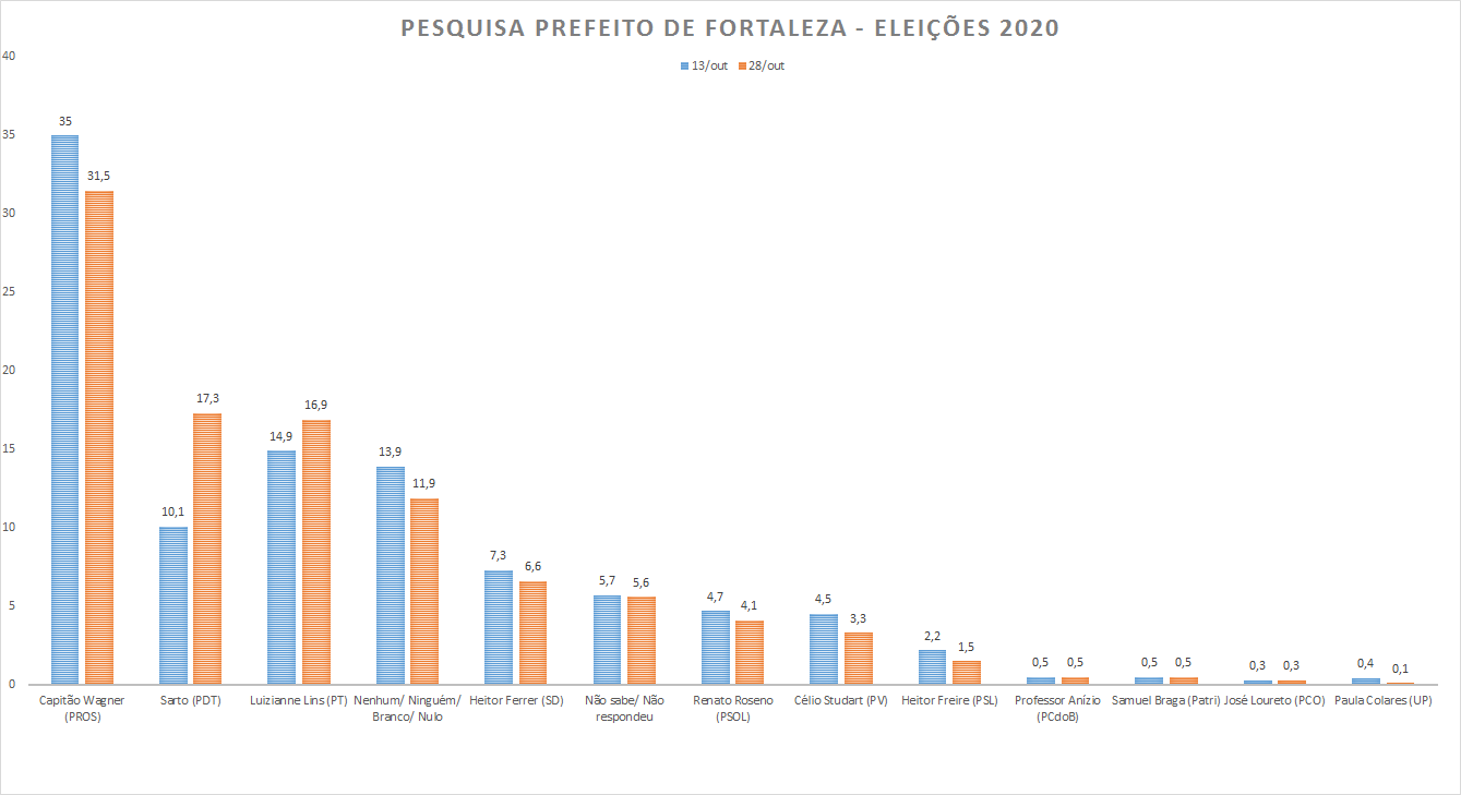Saiu a segunda Pesquisa do Instituto Paraná para as Eleições 2020 em Fortaleza. Entre as novidades da pesquisa, o fato de Sarto (PDT) aparecer a frente de Luizianne Lins (PT). O interessante é a queda de Wagner em quase 4 pontos e a ascensão de Sarto (em mais de 7 pontos) e de Luizianne (em 2 pontos). Outro número a averiguar ainda é alta taxa de rejeição de todos os candidatos, com mais de 11 (apesar da queda de 2 pontos em relação a pesquisa anterior).