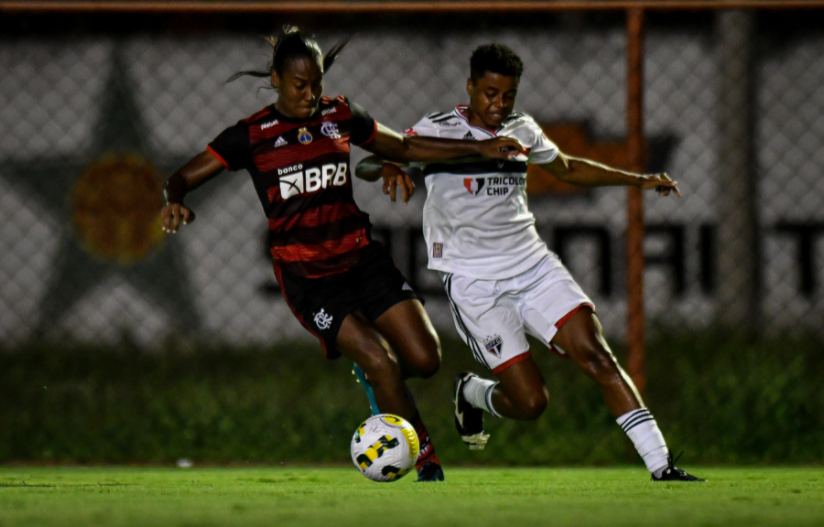 No encerramento da 1ª Rodada do Brasileirão Feminino 2022, Flamengo e São Paulo se enfrentaram no estádio Luso-Brasileiro, na noite da última segunda-feira (7). O tricolor paulista começou o jogo a mil por hora, e rápido, saiu na frente, com um gol da estreante Pardal. Teve todo o primeiro tempo em suas mãos, parecendo até que era o mandante do jogo, diante o controle que possuía das ações ofensivas do jogo. O Flamengo só se defendia e via o São Paulo perder um caminhão de gols. No segundo tempo, o castigo veio para as meninas do Morumbi. Com um gol de Gica, o Flamengo conseguiu o empate, que salvou a atuação meio atordoada da equipe, que tem um forte elenco, mas que provou que precisa de um tempo para as meninas se entrosarem mais. Para o São Paulo ficou o velho recado do Futebol: “Quem não faz, leva!” Um ponto para cada lado, mas com sentimento distintos, diante o que foi o jogo na Ilha do Governador.