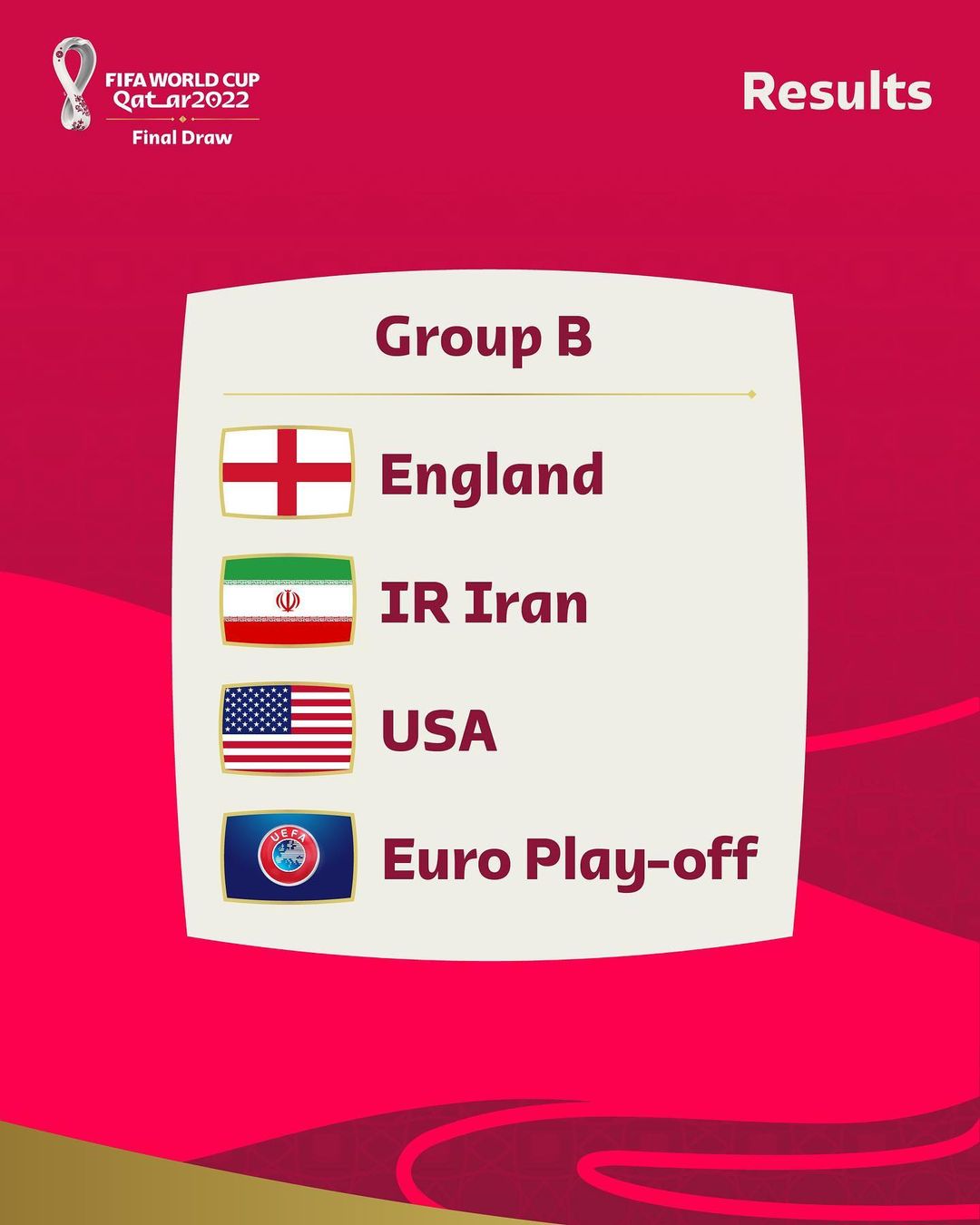 GRUPO B: Inglaterra; Irã; EUA; (País de Gales, Escócia ou Ucrânia)
