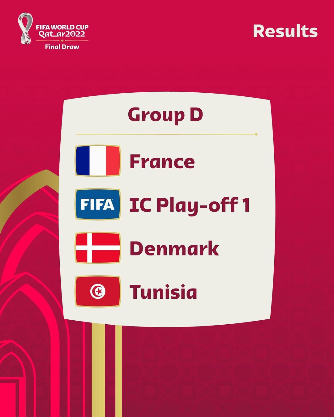 GRUPO D: França; (Austrália, Emirados Árabes Unidos ou Peru); Dinamarca; Tunísia.