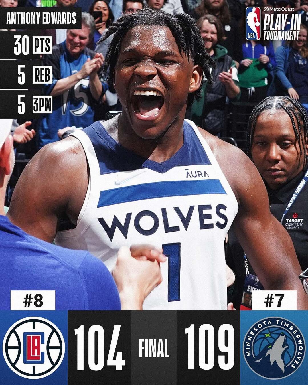 Em Minnesota, um jogaço com diversas troca de lideranças no placar. Clippers e Wolves não queriam saber de jogar na sexta, ambos queriam a classificação nesta terça. Um jogo tão equilibrado, precisava de algo para definir o vencedor, e nada melhor que um último quarto perfeito dos lobos. Com show de Edwards e Russell, os Wolves viraram para cima do time de LA, e assim, carimbaram sua vaga nos Playoffs.