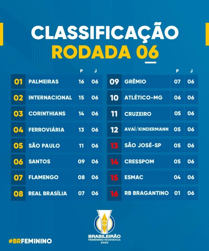 Nesta segunda-feira (18), três partidas encerraram a 6ª Rodada do Brasileirão Feminino.