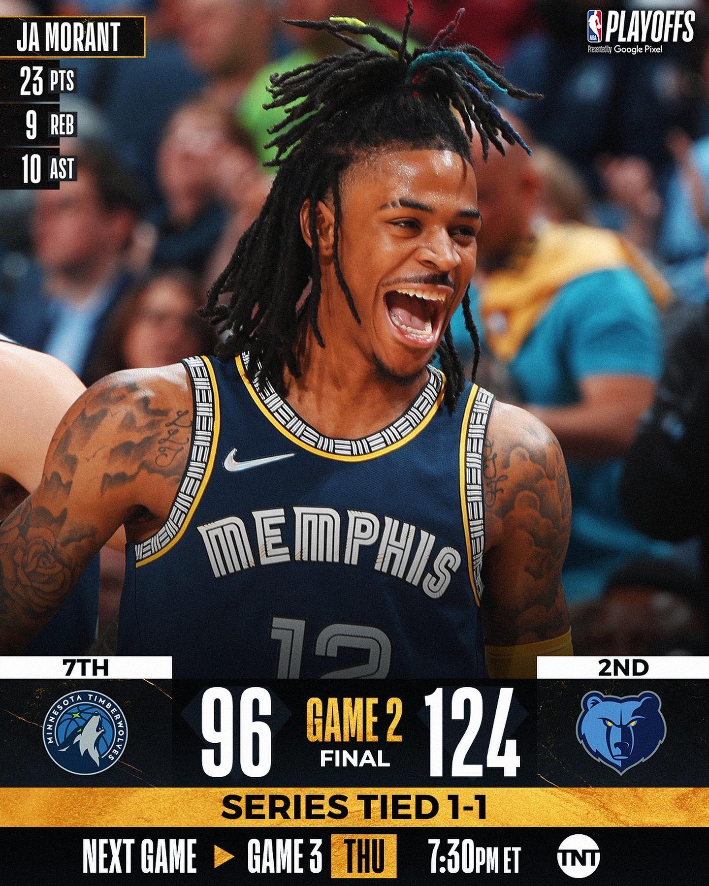 Em Memphis, Ja Morant meteu um “double double” para deixar o jogo 1 no passado e confirmar a sua excepcional temporada. Os Grizzlies colocaram os Timberwolves na roda e empataram a série.