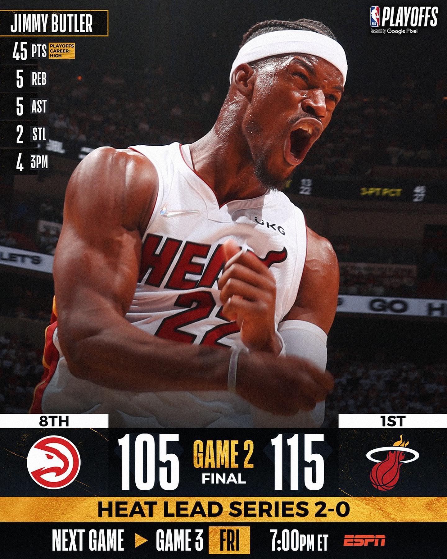 Na Flórida, Butler voou e sua excelente partida foi decisiva para a vitória diante os Hawks. O time de Trae Young lutou, mas Butler estava no seu dia. Heat venceu e colocou 2×0 na Série. O Miami Heat foi o único time da noite que conseguiu ir dormir com vantagem em seu duelo.
