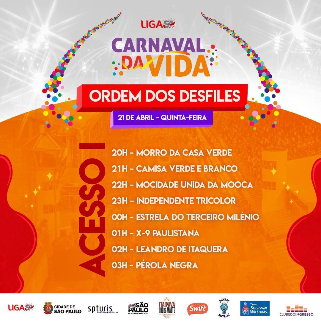 Nesta quinta-feira (21) ocorrem os desfiles das escolas de São Paulo do Grupo de Acesso 1. Oito agremiações desfilarão em busca do lugar entre as melhores no próximo ano. Entre as disputantes estão escolas com títulos no Especial como X-9 Paulistana e Camisa Verde e Branco. Além disso, temos escolas que buscam chegar pela 1ª vez no Especial como Estrela do Terceiro Milênio e a Mocidade Unida da Mooca. Leandro, Pérola, Independente e Morro também querem exibir o quanto suas comunidades são fortes e criativas.