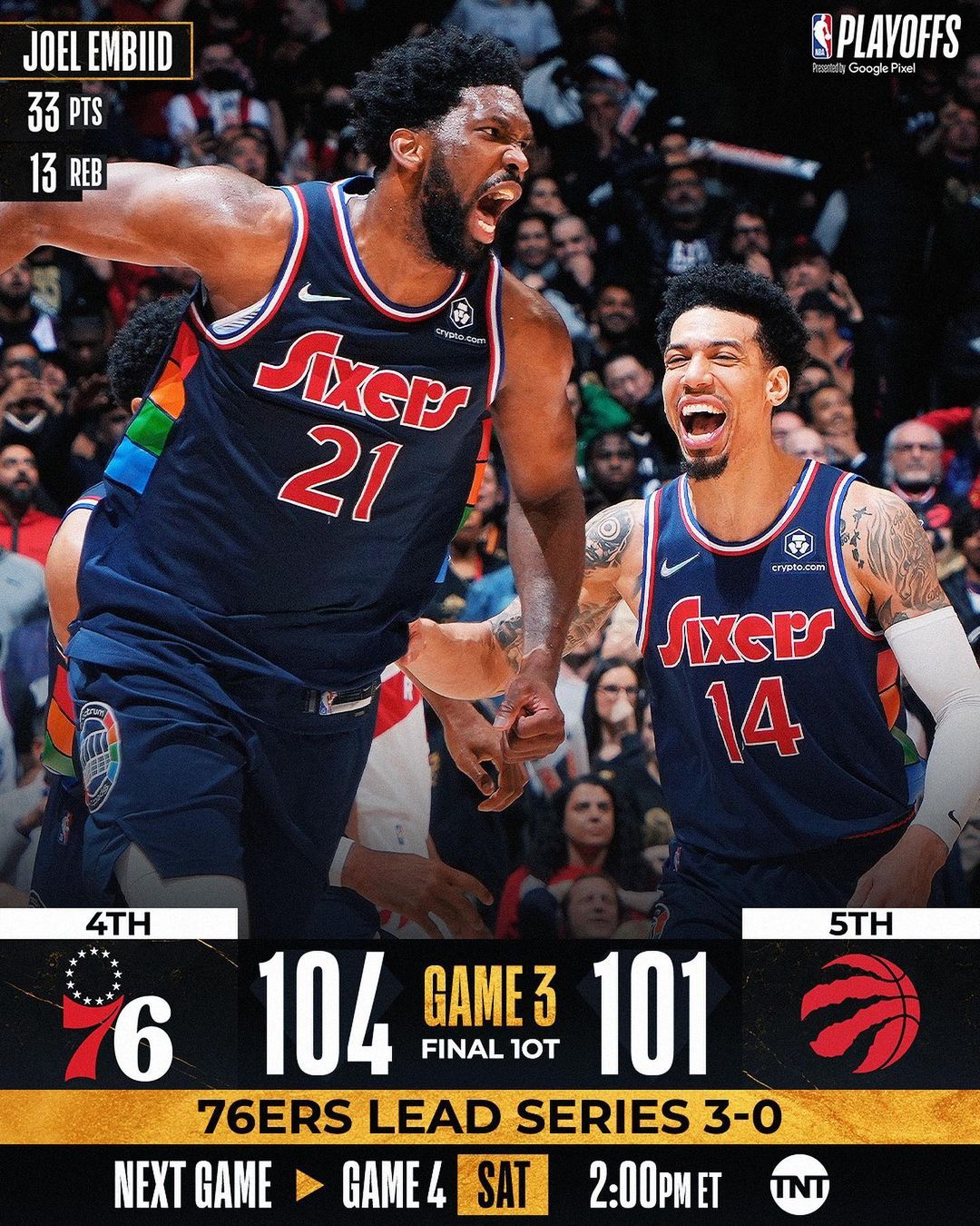 Em Toronto, os Raptors surpreenderam os 76ers, lutando bravamente em busca da vitória, e até chegaram perto de ter esta, mas os 76ers reagiram e levaram o jogo para o Overtime. Quando o jogo parecia ir para o segundo overtime, Embiid achou a bola que precisava para encaminhar o confronto e coroar a terceira vitória do time da Filadélfia sobre os canadenses. No último segundo, uma cesta de três épica! Embiid monstro!