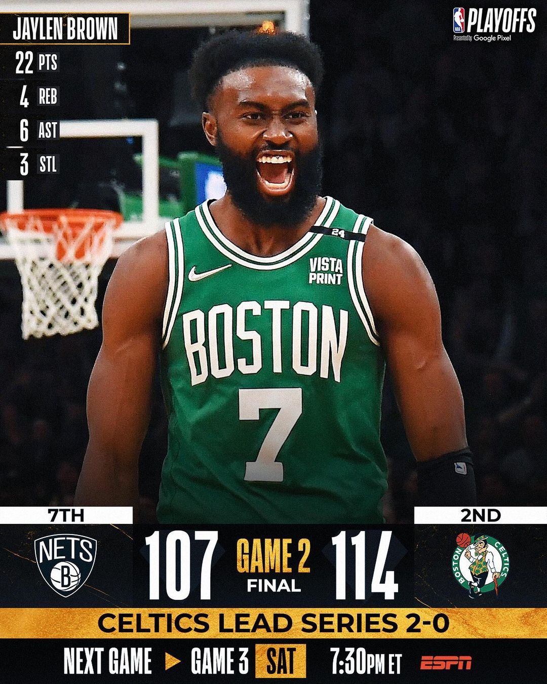 Em Boston, os Nets chegaram com tudo, fazendo um primeiro tempo perfeito, principalmente, o primeiro período. A dupla fez o estrago que se imaginava, Irving e Durant voaram. Porém, o segundo tempo dos Celtics foi incrível! O jogo coletivo fluiu, a marcação de Marcus Smart e Jason Tatum anulou Irving e Durant, enquanto Jaylen Brown acabava com os Nets com cestas impecáveis. Na última parte do quarto período, o jogo já estava controlado pelo time de Verde. Uma virada poderosa, aonde os Celtics confirmaram as 2 vitórias em casa. Brown, você é o cara!