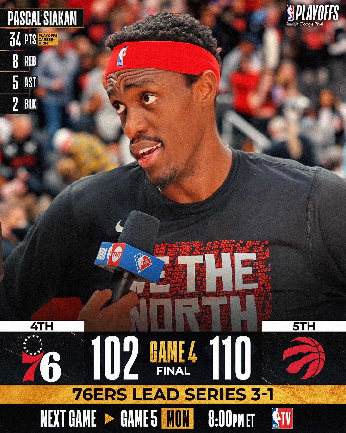 Em Toronto, os Raptors evitaram o fim da série. Em tarde inspirada de Pascal Siakam, os canadenses conseguiram controlar e vencer o jogo contra o 76ers. Agora a série vai para Filadélfia, aonde Embiid e companhia tentarão carmbar a vaga nas Semifinais do Leste.