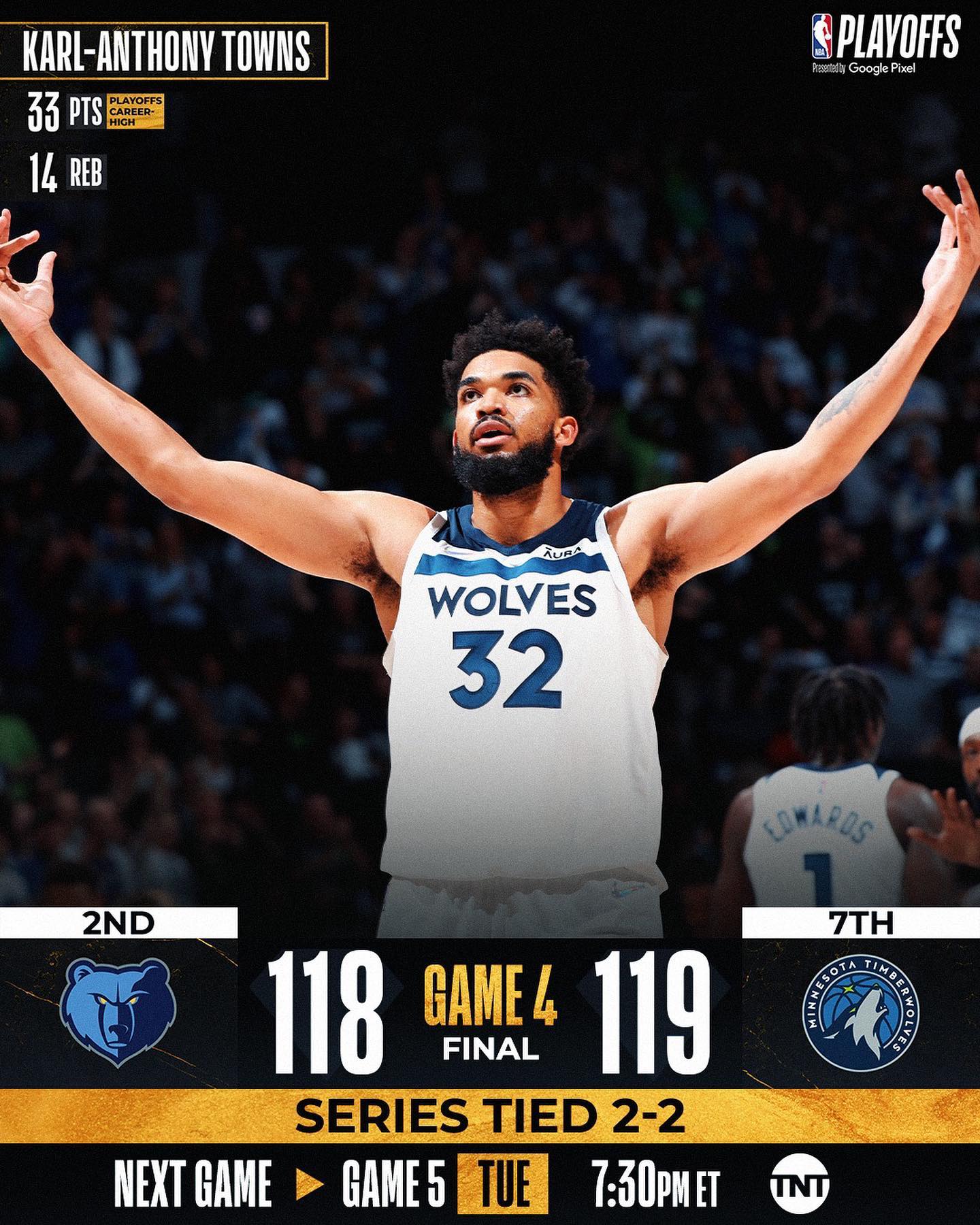 Em Minnesota, Towns e seu duplo-duplo ajudaram (e muito) os Wolves a empatarem a série contra o fortíssimo Grizzlies.