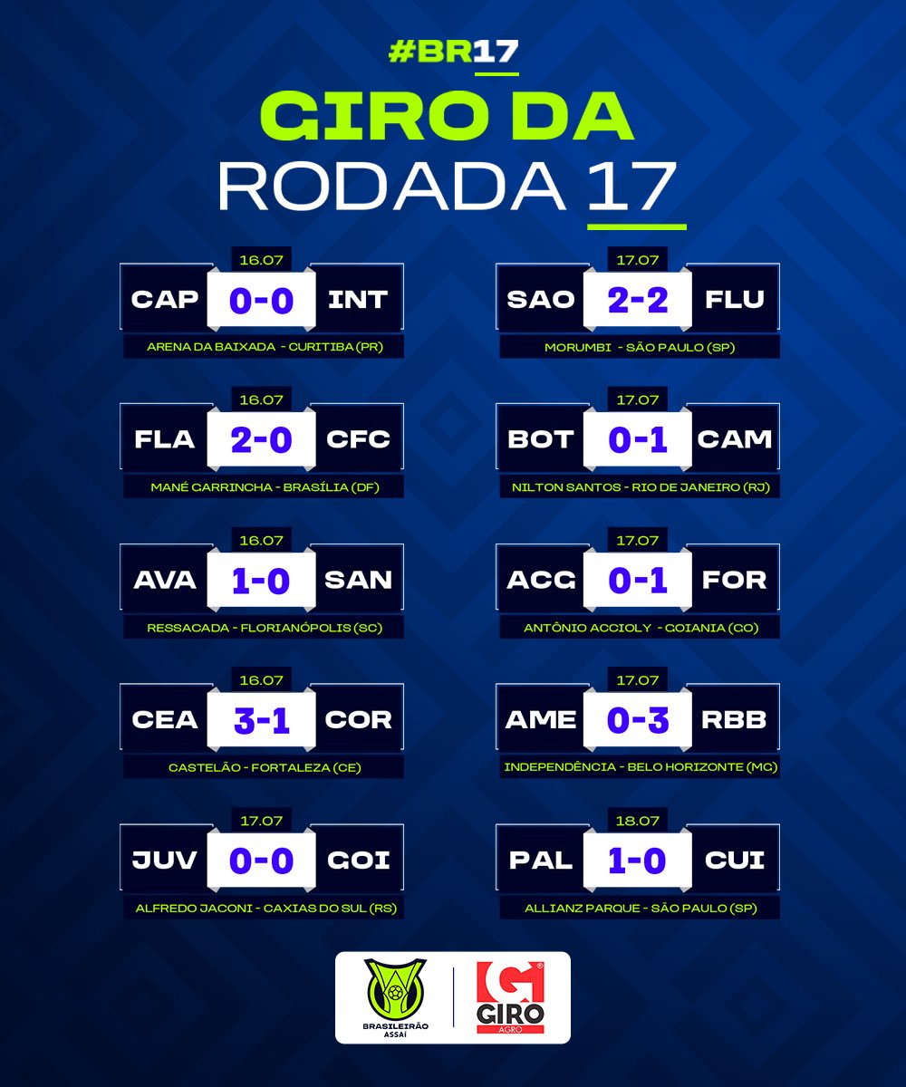 Nos jogos da noite, o Fortaleza segurou o Atletico Goianiense e saiu com a vitória do Antônio Aciolly. O Leão saiu da lanterna, enquanto que o Dragão permaneceu no Z4. No Independência, o Red Bull Bragantino nocauteou cedo o América e voltou a primeira página da classificação. Já o coelho retornou para a Zona de Rebaixamento. No Nilton Santos, Zaracho quebrou a “nhaca” do Atlético no jogo com um golaço sem querer e ainda colocou o atual campeão brasileiro na vice-liderança do campeonato. Enquanto isso, o Botafogo volta ao bolo de times que podem para qualquer lado nesse campeonato.
