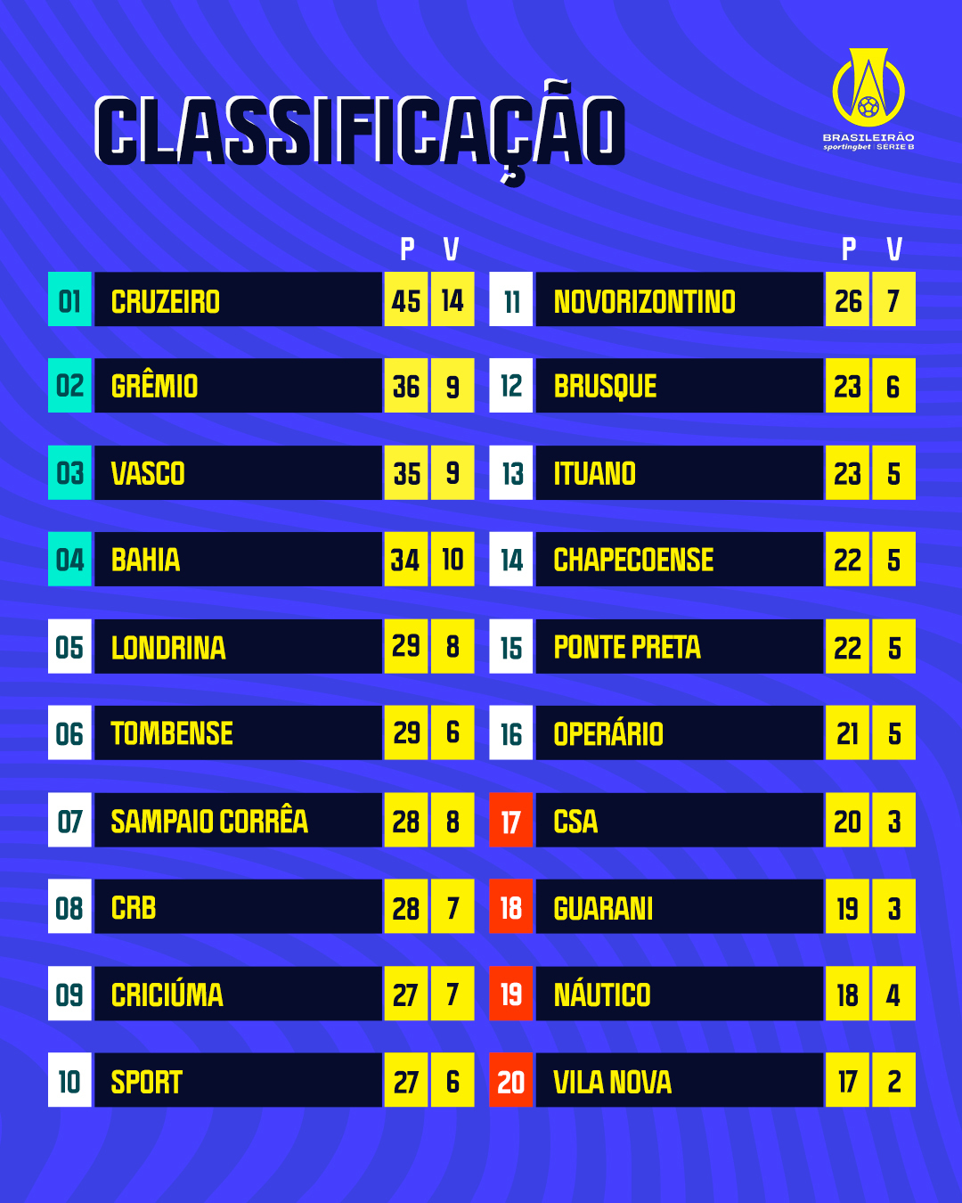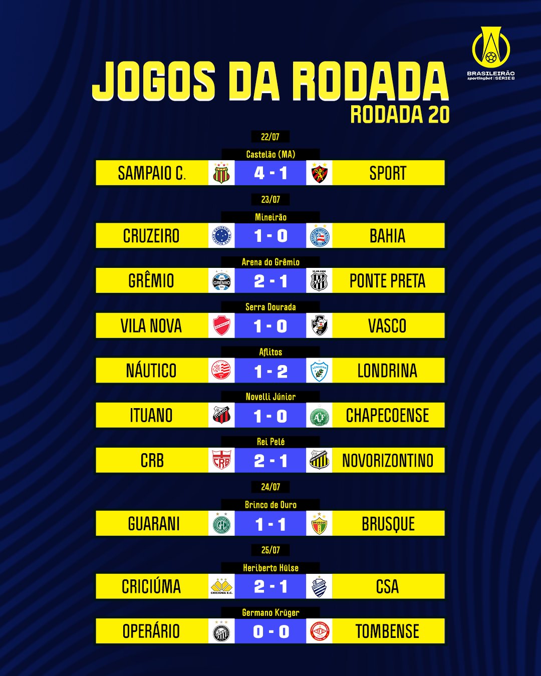 O Returno da Série B iniciou pegando fogo! Já no primeiro jogo, o Sampaio Corrêa se manteve invicto em casa e aplicou uma surra em cima do Sport. Enquanto o Bolívia ascende no campeonato, o Leão segue em queda. Quem também vem mal é o Vasco, mesmo sossegado no G4, o cruzmaltino perdeu de novo, agora para o lanterna Vila Nova. Aliás, será esse início da reação do tigre? Falando em tigre, o Novorizontino foi até Alagoas e perdeu para o CRB. O Galo segue se recuperando no campeonato. Falando em Galo, o Ituano voltou a vencer no campeonato. O triunfo veio sobre a Chape. Falando em triunfo, o Bahia viu o todo poderoso Cruzeiro vencer um jogo aonde os tricolores mandaram. Rafael Cabral não deixou a virada acontecer. Já em Recife, o Londrina veio irresistível no segundo tempo e virou para cima do Náutico, o time paranaense grudou no G4, enquanto o time pernambucano é vice-lanterna. Ainda sobre viradas, a bicicleta de Diego Souza marcou a vitória do Grêmio sobre a Ponte. O imortal tricolor é o novo vice-líder. Fechando a rodada, no domingo, Guarani se torna o novo rei do empate ao empatar com o Brusque. O bugre segue no Z4, enquanto o Brusque está ali próximo. No Germanão, o Tombense empatou (fato “inédito”) com o Operário e perdeu a chance de colar no G4. Enquanto isso, o Fantasma só não entrou no Z4, porque o CSA tomou a virada do Marquinhos Gabriel, ops, do Criciúma, e permaneceu entre os rebaixados. Já o Tigre voltou a primeira página da tabela.