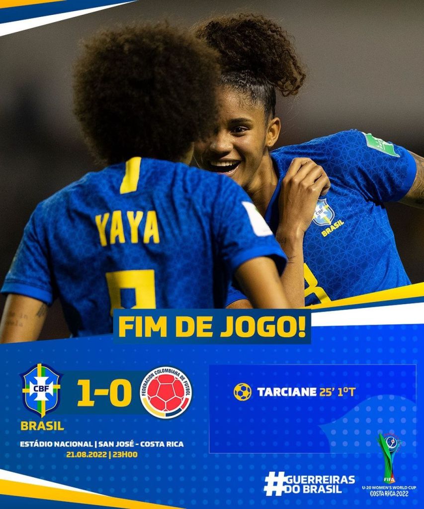 Histórico! Depois de 16 anos, a seleção feminina está de volta as Semifinaisde um Mundial Sub-20. Na noite do último dia 20, a seleção superou a forte seleção colombiana por 1×0, com gol de pênalti de Tarciane. Apesar do placar apertado, a seleção foi dona do jogo, mal permitindo que as colombianas vissem a cor da bola. Nem mesmo a craque Linda Caicedo conseguiu criar algo. Enquanto isso, nossas meninas tiveram alguns gols anulados, seja por impedimento ou falta, que impediram do placar expressar a realidade do jogo.