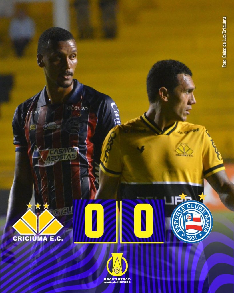Em Santa Catarina, o Criciúma segurou o Bahia e o empate foi ruim pra ambos, apesar do tricolor baiano seguir tranquilo no G4. Já o tricolor catarinense perdeu a chance de colar na luta pelo acesso.