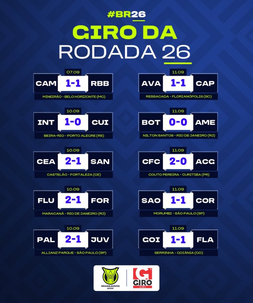 Só o Coritiba venceu no domingo! Dos 5 jogos deste 11 de Setembro, apenas o Coxa conseguiu arrancar 3 pontos, nas outras 4 partidas, só empates. O campeonato, praticamente, não andou nesta rodada, se não fosse o Sábado e o Coritiba, tudo estaria como estava na 25ª Rodada.