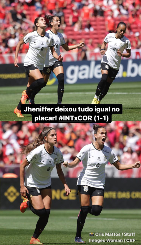 No segundo tempo, ocorre o inverso, quando o Internacional tinha o controle do jogo e aparentava está mais perto do segundo gol, o Corinthians empatou em um contra-ataque velocissimo, finalizado pela ex-colorada Jheniffer. Tudo igual na ida e decisão jogada para o próximo sábado em Itaquera.