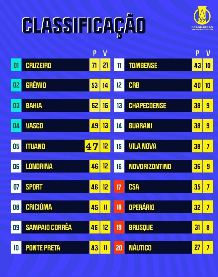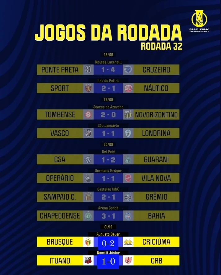 Faltam apenas 6 Rodadas e já temos campeão! O Cruzeiro amassou a Ponte Preta e se sagrou campeão da Série B, graças as derrotas de Grêmio e Bahia, que jogando como visitantes contra Sampaio Côrrea e Chapecoense, voltaram para casa sem pontos. Vasco e Londrina empataram e viram uma turma chegar na briga pelo G-4. Destaques para o Sport, que virou e afundou o rival Náutico, o Ituano, que é o novo 5º e parece imparável, e o Criciúma, que venceu o Brusque no duelo catarinense, chegando junto da turma que briga pelo acesso e afundando o rival estadual. Na luta contra a degola, o Vila Nova, para surpresa de zero pessoas, empatou contra o Operário, foi o 17º empate do tigre goiano. O Alvirrubro segue fora da zona, enquanto que o Fantasma viu a turma se afastar. O Guarani virou para cima do CSA em Alagoas, e respirou no embate contra a degola. Rodada 33 já começa no início da semana e promete ser emoção no mesmo embalo.