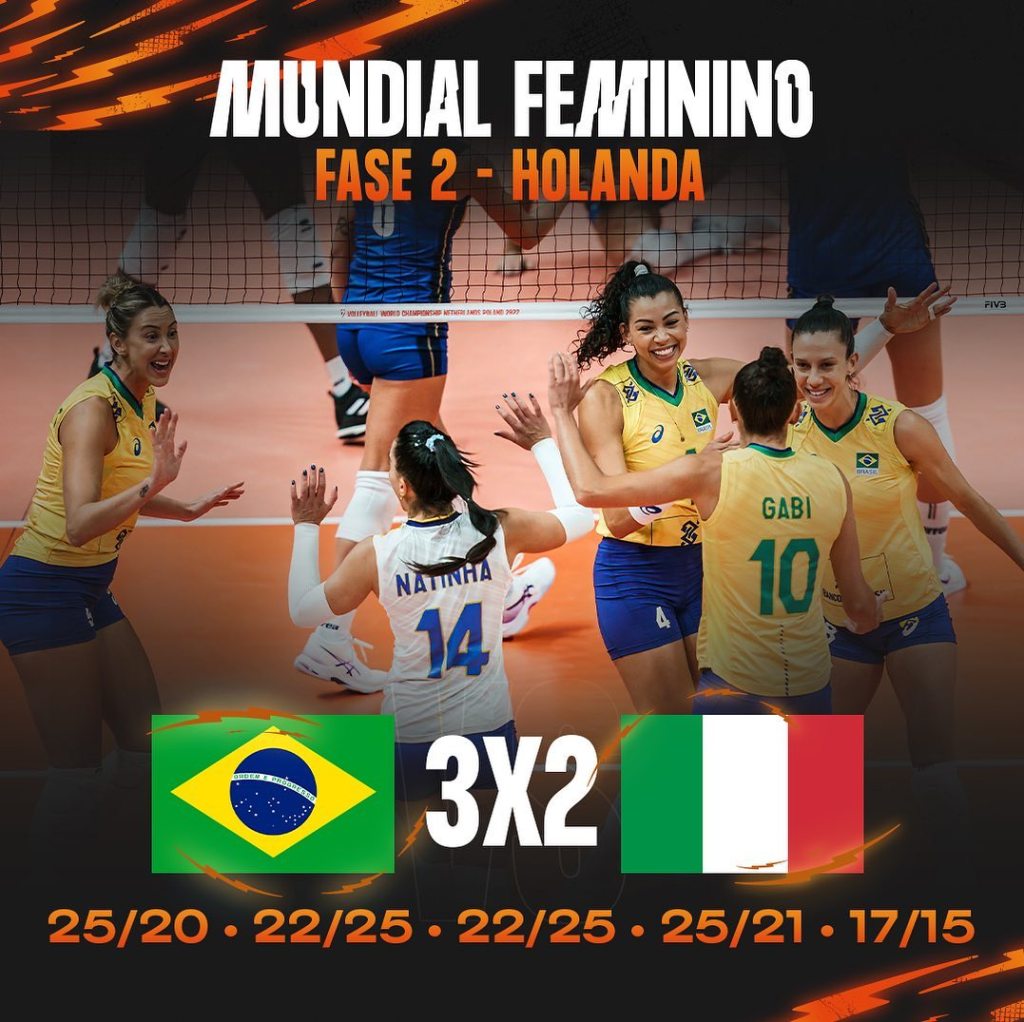 Com uma atuação de GALA da capitã e uma grande exibição coletiva, a Seleção acabou com a invencibilidade da Itália no Campeonato Mundial: 3×2 (25/20, 22/25, 22/25, 25/21 e 17/15), de virada, em Roterdã, na abertura da segunda fase. Foram incríveis 30 acertos da ponteira, que segue voando na competição. A Itália, até chegou a ameaçar, mas o time Brasileiro estava focado e sem medo de ser feliz. Mesmo com Egonu arrancando pedaço de chão com a porrada sem piedade que executava, o ponto final saiu de um block gigante de Carol sobre ela. Melhor jogo da seleção no Mundial. Destaques individuais é difícil definir, pois todas que entraram jogaram muito. Macris, Tainara, Gattaz… Todo mundo jogando pra caramba!