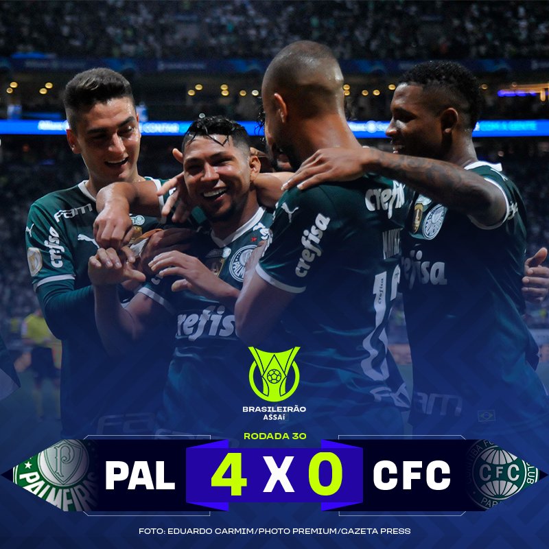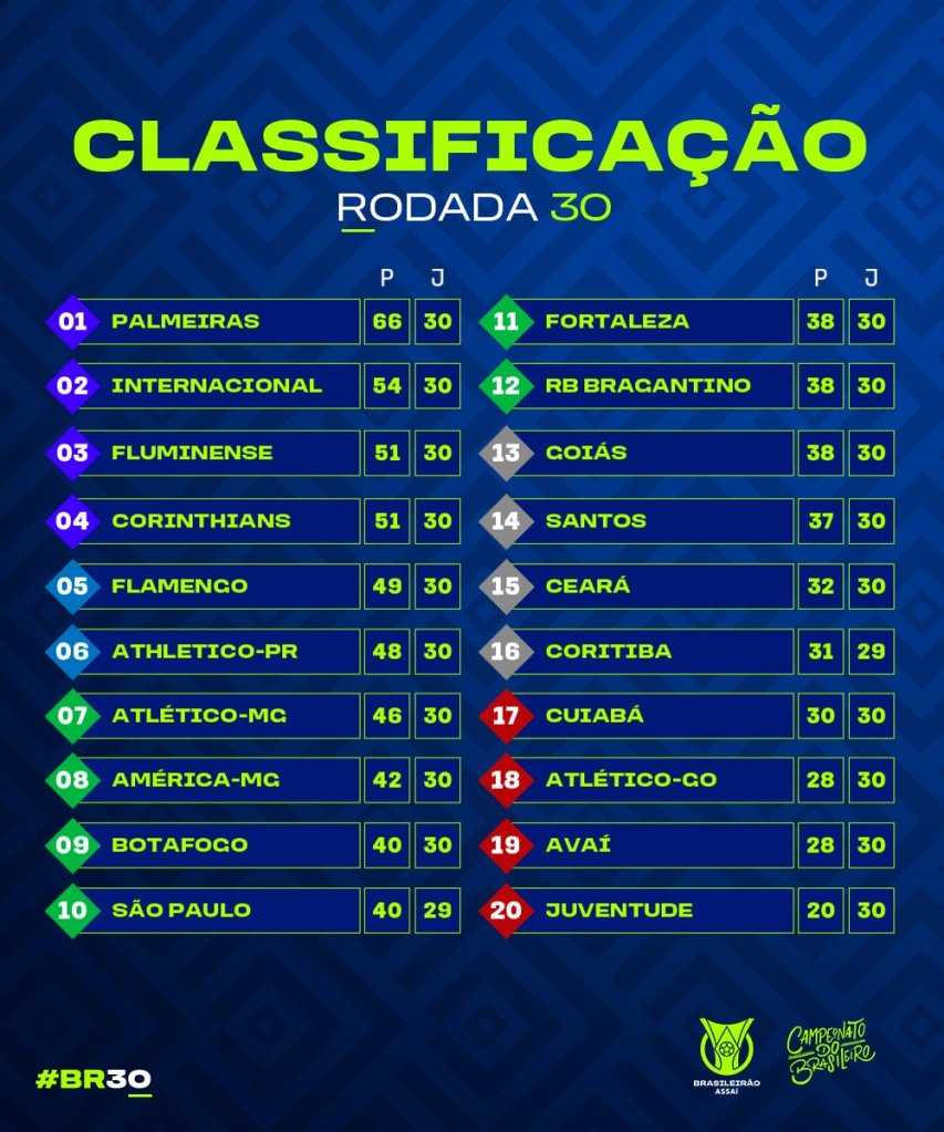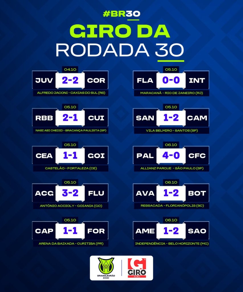 Rodada importante para definir destinos no Campeonato! Ninguém do G6 venceu, Flamengo e Internacional empataram entre si no Maracanã, o Athletico Paranaense escapou da derrota pro Fortaleza na Arena da Baixada no fim da partida, enquanto o Corinthians não conseguiu vencer o lanterna Juventude e o Fluminense tomou uma virada épica do Atlético Goianiense, que volta a sonhar com a sobrevivência na elite. O único a conseguir os 3 pontos foi o Palmeiras, que amassou o Coritiba e saiu do Allianz Parque ainda mais líder. O jogo marcou a 100ª vitória da comissão técnica de Abel pelo Palmeiras e a estreia de Endrick, aos 16 anos, no time profissional, faltando apenas o gol para cereja do bolo.