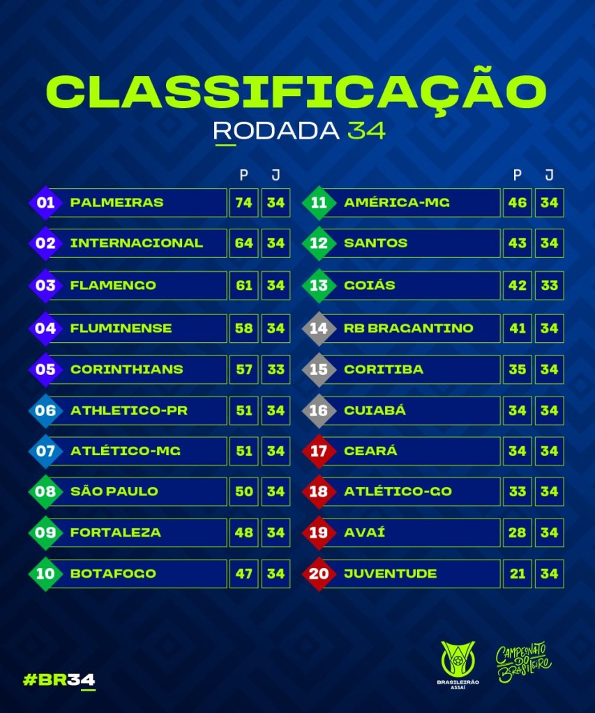 Na luta por Libertadores, o Atlético Mineiro sofreu, mas bateu o Juventude e se mantém no G8. Aliás, o Jaconero é o primeiro rebaixado desta edição. O Fortaleza jogou muito e superou o Coritiba no Castelão. O tricolor cearense só não entrou no G8, porque no último minuto no Morumbi, o São Paulo venceu o Atlético Goianiense, o que lhe rendeu a oitava posição. O Botafogo, também no apagar das luzes, venceu o Red Bull Bragantino e mostrou está disposto na luta por Libertadores. América Mineiro e Goiás empataram, em um jogo incrível na Serrinha, e ambos seguem sonhando com um lugar no principal torneio da CONMEBOL. O Santos poderia está no páreo, mas o “assalto” no Maracanã, distanciou o Peixe da vaga. O Flamengo que não tem nada a ver com isso, venceu na despedida de casa antes da Final da Libertadores 2022.