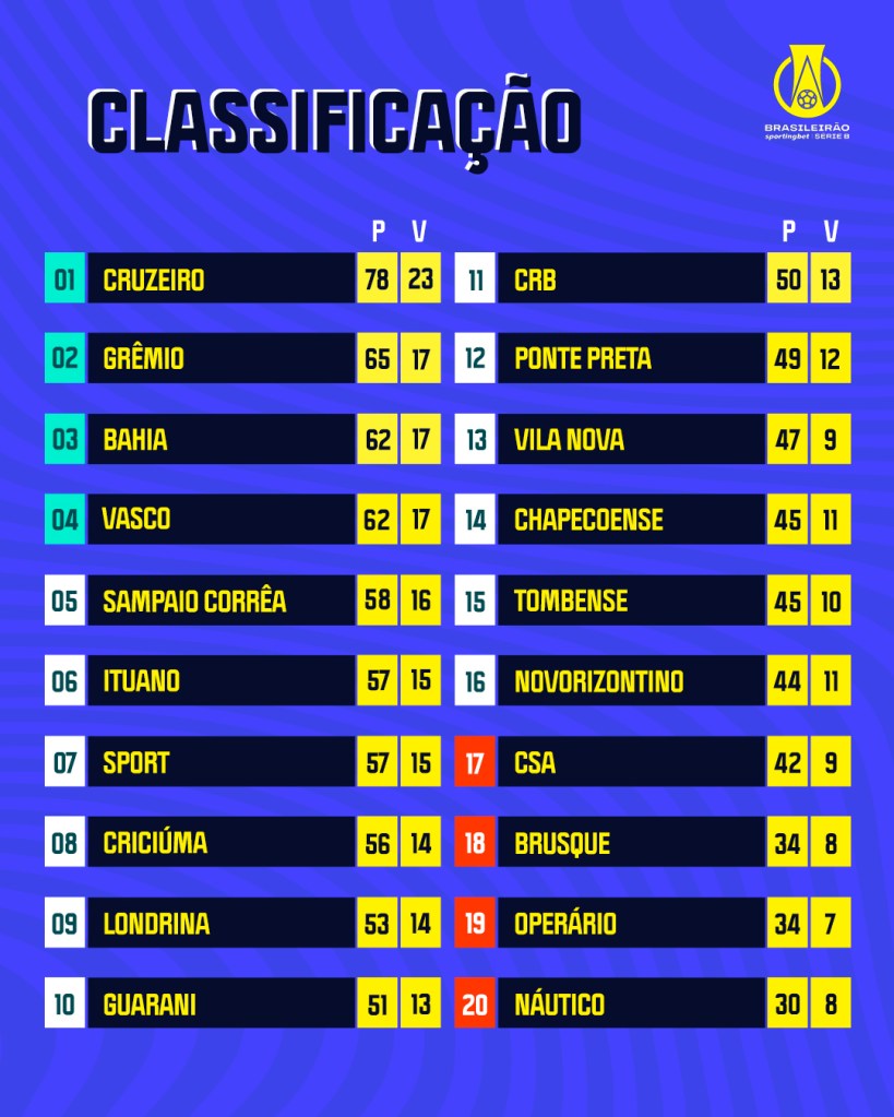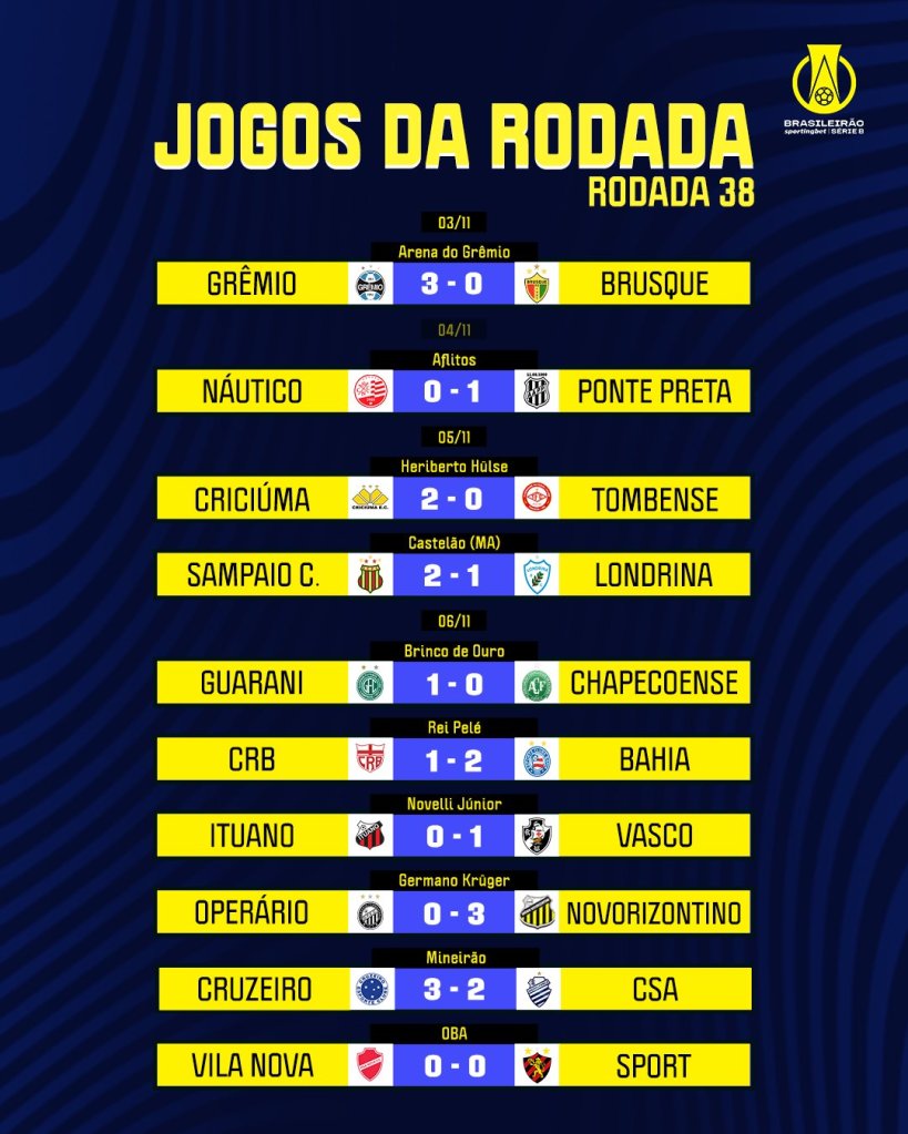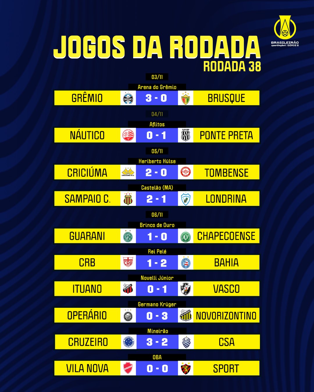Com o fim do campeonato, afirmamos que Cruzeiro, Grêmio, Bahia e Vasco são os promovidos, enquanto que CSA, Operário, Brusque e Náutico são os rebaixados.