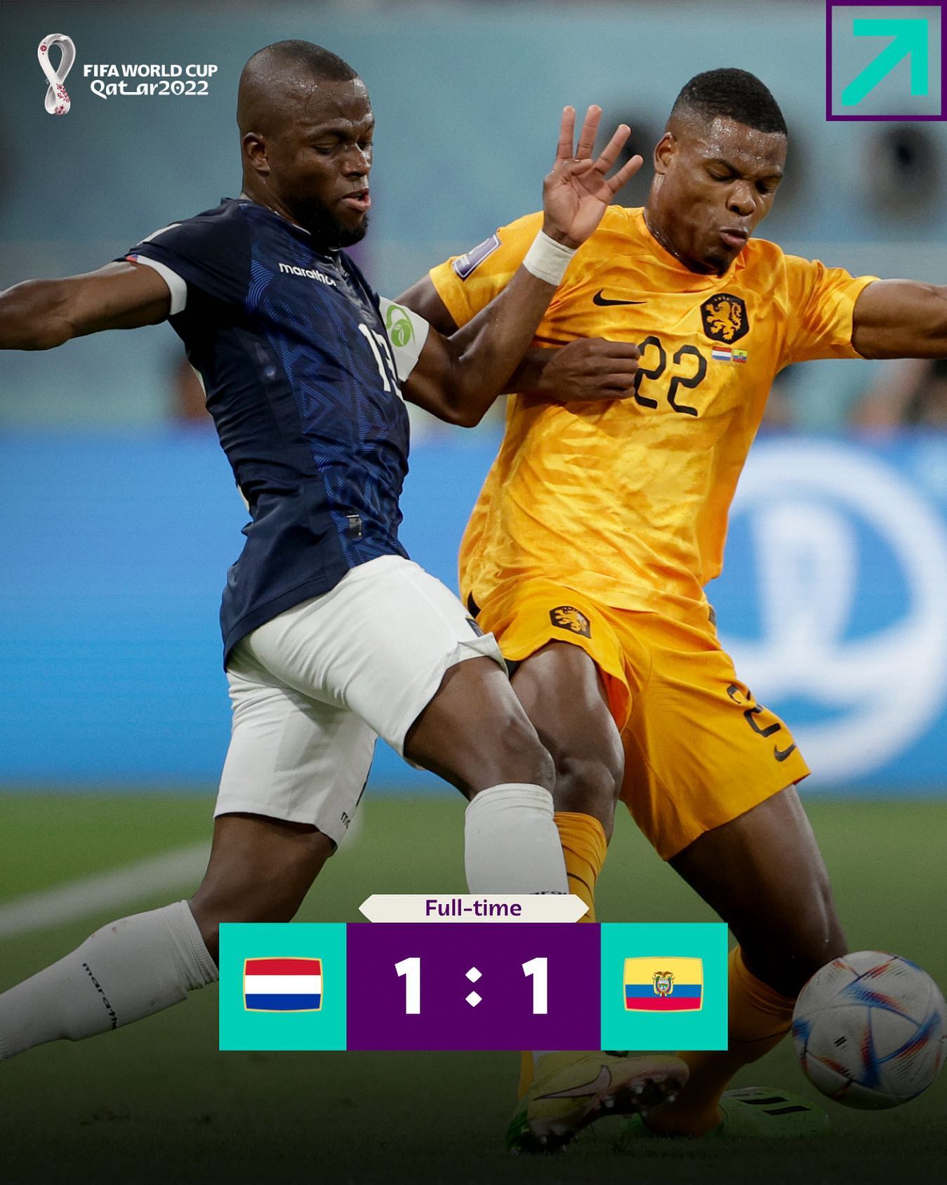 Na outra partida do grupo, os Países Baixos abriram o placar nos primeiros 5 minutos de jogo e só. O Equador dominou a partida, Valencia marcou seu terceiro gol no Catar, porém apenas um empate foi alcançado. O resultado jogou o Equador para o confronto direto contra Senegal na próxima terça-feira (29), enquanto os Países Baixos defende sua classificação contra o Catar.
