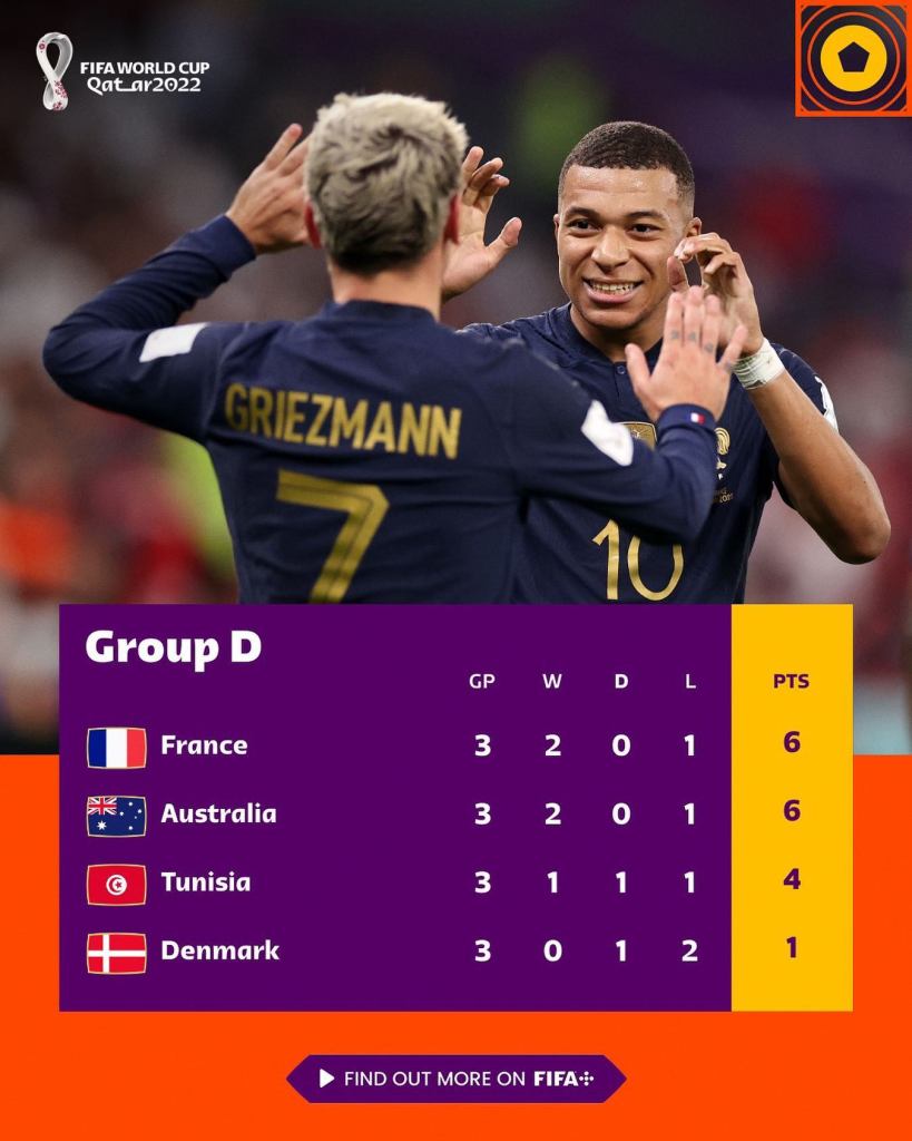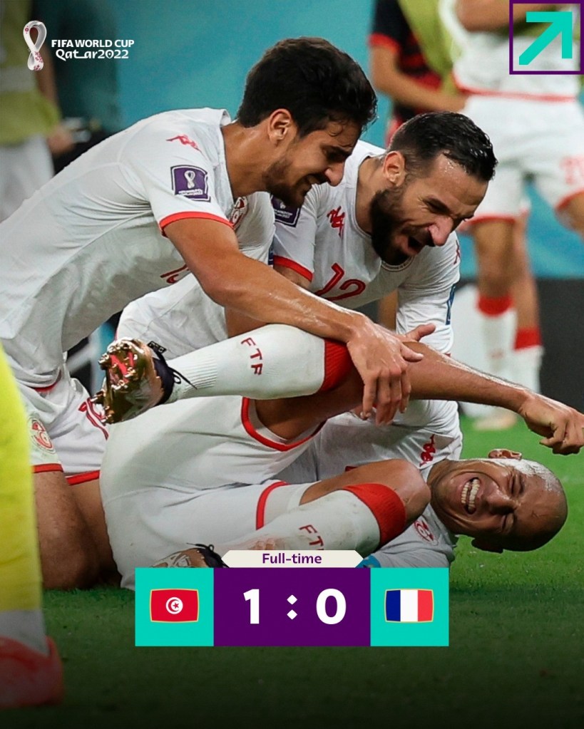 A Tunísia até surpreendeu a França, com um golaço de Khazri, venceu por 1×0. O jogo ainda teve um gol de Griezmann anulado pelo VAR no último instante da partida. O resultado serviu apenas de revanche da ex-colônia contra sua ex-metrópole, porque a eliminação ocorreu, porém uma eliminação de cabeça erguida, de uma valente e guerreira Tunísia. Aos franceses, liderança intacta e o próximo passo são as Oitavas.