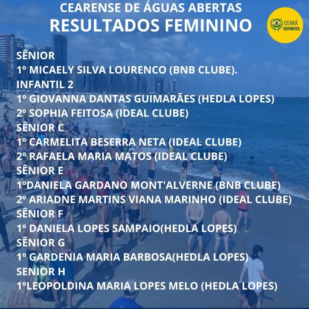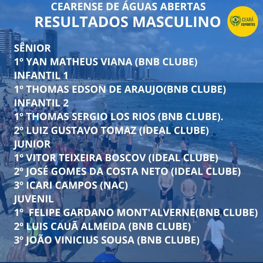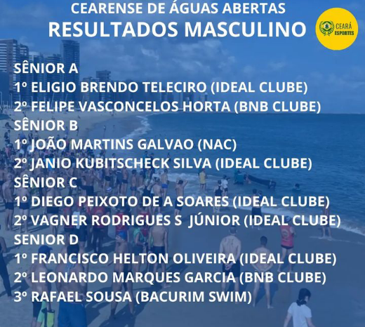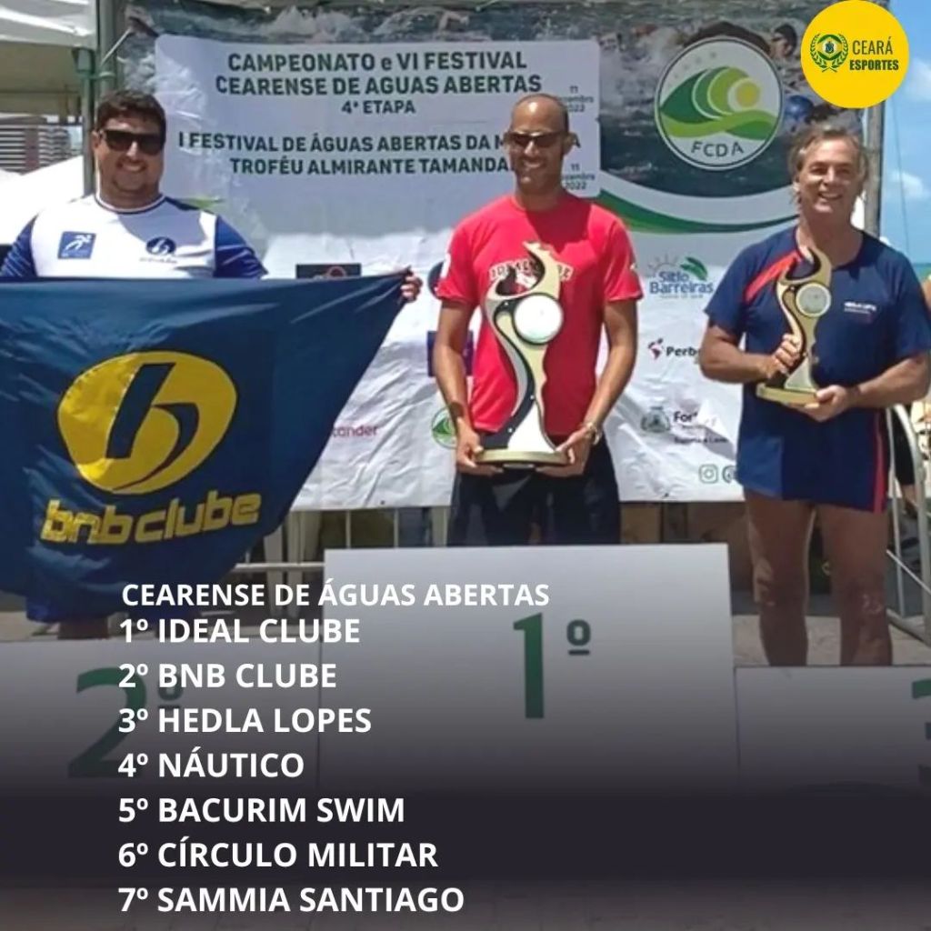 Por fim, o campeonato teve como seu Campeão, o Ideal Clube / CFO 🏆 ! O BNB Clube, ficou com o vice🥈, já a Academia Hedla Lopes saiu ostentando o Bronze 🥉No Festival de Águas Abertas, o campeão foi o Náutico Atlético Cearense 🏆, enquanto que o vice e o terceiro, repetiu-se do Campeonato Cearense. BNB 🥈 e Academia Hedla Lopes 🥉.