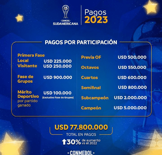 A Conmebol divulgou os valores a serem recebidos por cada equipe na disputa da CONMEBOL Libertadores 2023. As cifras, em dólares, são as maiores já ofertadas pela instituição desde a criação do torneio. Além disso, a CONMEBOL, pagará um valor especial para cada vitória na fase de Grupos, como a UEFA já faz na Champions League.