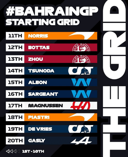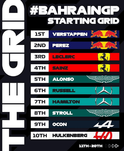 A temporada 2023 da Fórmula 1 começa como terminou 2022. Alonso, até surpreendeu nos treinos livres com sua Aston Martin, mas na hora do “pra valer”, ninguém foi páreo para o holandês voador. Pole para o bicampeão Max Verstappen, da Red Bull Racing. Ao seu lado no grid, Sérgio Perez, companheiro de equipe, fechando a primeira filha. As Ferraris de LeClerc e Sainz vem logo em seguida.
