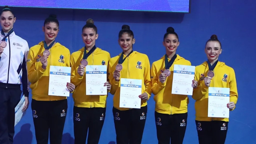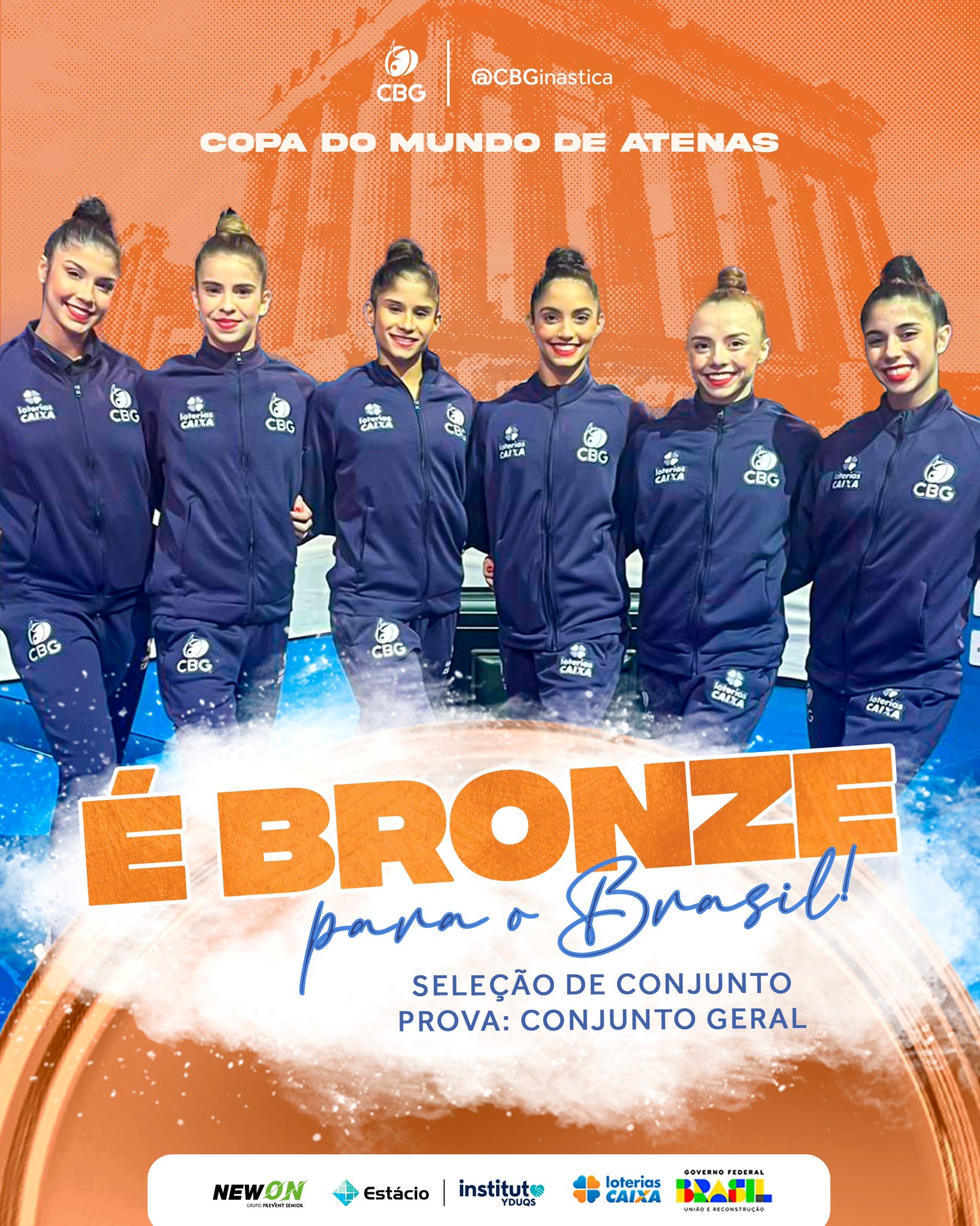 Na etapa de Atenas da Copa do Mundo, a Seleção Brasileira conquistou um resultado incrível e inédito para a Ginástica Rítmica. Neste sábado (18), ao registrar 63.850 pontos [(28.850 pontos na série mista (duas bolas e três fitas) e 35.000 (cinco arcos)] no Conjunto Geral, as meninas conquistaram o Bronze, ficando atrás apenas de Israel (65.450) e Bulgária (64.700), respectivamente.