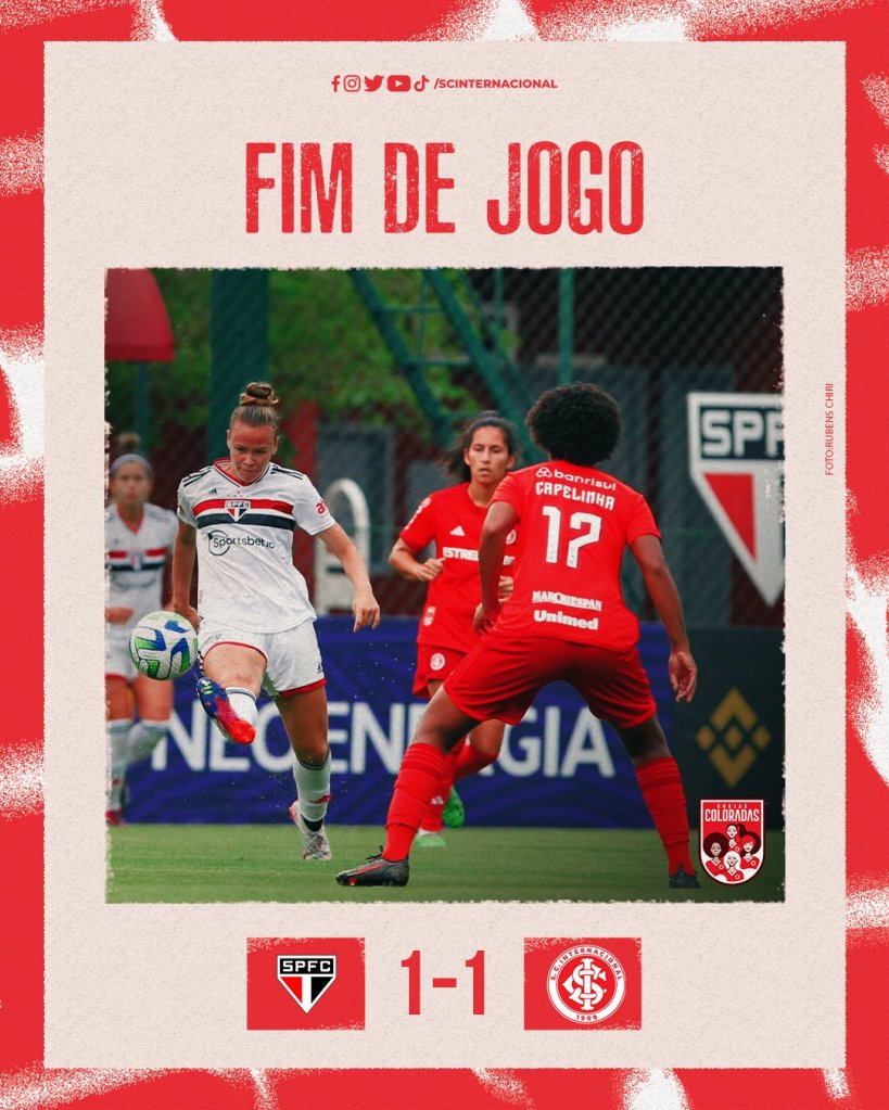 Em Cotia, mais um empate para a conta do São Paulo. As meninas do tricolor até saíram na frente com o gol de Dudinha no primeiro tempo, porém Fany Gauto fez seu primeiro gol com a camisa das Gurias Coloradas, garantindo um pontinho importantíssimo para o Internacional.
