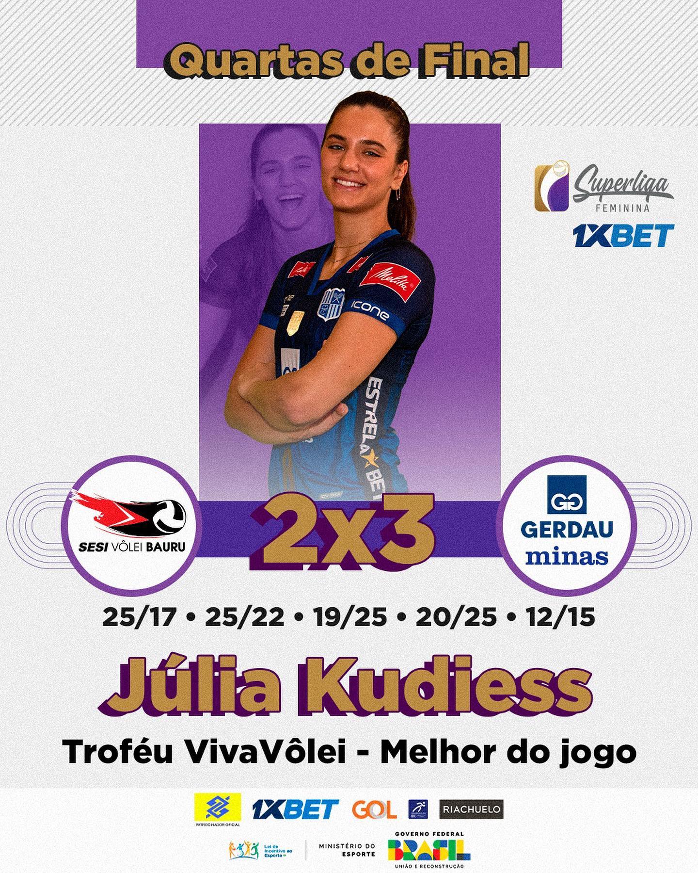 Em Bauru, o Sesi Bauru chegou a aprontar contra o Gerdau Minas, abrindo 2×0 no placar de sets, e pelo desenvolvimento do jogo até ali, parecia que estava tudo tranquilo para as paulistas. Porém, Júlia Kunis entrou no jogo como um motor motivacional e técnico necessário para o atual tricampeão mostrar porque quer o Tetra. Uma virada épica e justa, muito justa, justíssima. Agora serão 2 jogos em BH, aonde as mineiras precisarão vencer apenas um para chegar mais uma vez nas Semifinais.