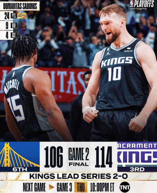 Na Califórnia, o duelo entre o time da Capital e de San Francisco foi um jogaço. Uma partida de sair lasca, decidida nos detalhes, exatamente como no primeiro jogo da série. Green ejetado, Curry, Thompson e Wiggins pontuando muito para os Warriors, mas Sabonis e Fox aterrorizando, do lado Rei. O time de Sacramento após 17 anos longe dos Playoffs, voltam peitando o atual campeão, metendo um importante 2×0. Primeira vez que a geração Curry se ver assim nos Playoffs.