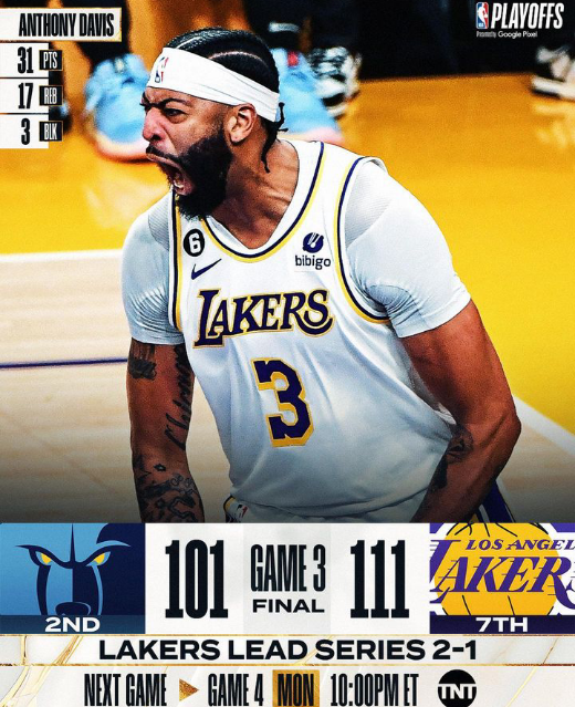 Fechando a noite, os Lakers destruíram os Grizzlies defensivamente no primeiro período (permitindo ocorrer apenas 9 pontos para o time de Memphis), o que foi suficiente para administrar a vantagem e sair com a vitória. LeBron e Davis doutrinaram nos segundo e terceiro períodos. Nem mesmo o último período espetacular de Ja Morant (ele fez 45 dos 101 pontos de seu time, com 30 apenas no período final) foi suficiente para tomar o triunfo do time da Califórnia. 2×1 na série para o time do “velho” LeBron, que vem calando o bocudo do Brooks,na bola sem precisar “pegar nas bolas”.