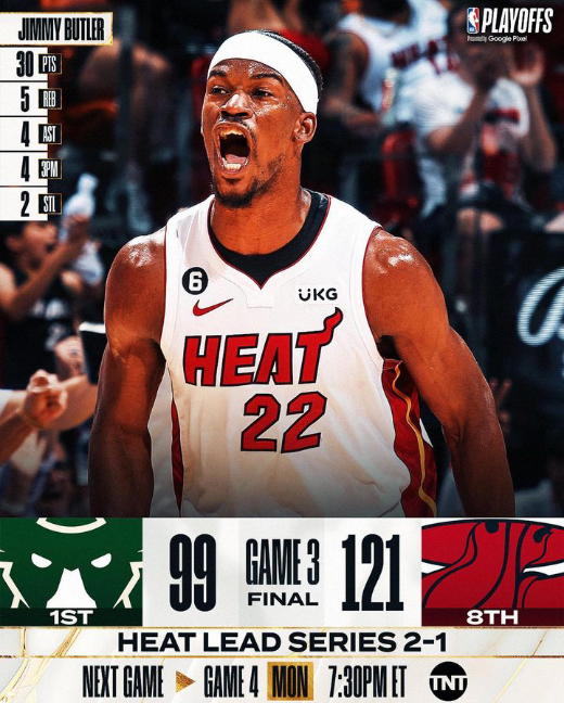 Ainda pela 3ª Rodada, a Flórida pegou fogo com o Heat! Em um espetacular jogo de Butler, o time de Miami bateu, novamente, os Bucks, e reassumiu a liderança da série. O time de Antetokounmpo e Holliday precisarão jogar muito para diminuir a vontade de vencer do Heat.