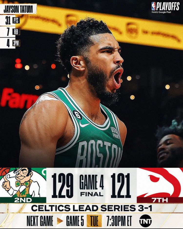 Em Atlanta, os Celtics também tiveram amplo domínio da partida sobre os Hawks por causa toda a partida. Porém, com um último período perfeito de Trae Young, o Atlanta chegou a ver a diferença ficar a uma cesta. Foi aí que Tatum, Brown e Williams despertaram nos minutos finais, e mantiveram a liderança do Celtics no jogo e na série. Tatum com uma cesta mágica no estouro dos 24 segundos, e Brown e Williams com uma sequência incrível de rebotes e enterradas. Os Celtics mostraram o seu lado casca grossa diante o valente Atlanta Hawks com talentosíssimo Trae Young.