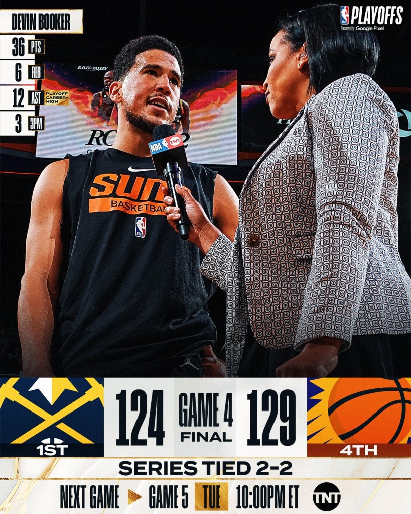 No Arizona, nem o “duplo-duplo” e os mais de 50 pontos de Jokic evitaram a derrota dos Nuggets para os Suns. O time de Booker e Durant viram suas estrelas brilharem e o banco decidirem o jogo. As 5 cestas de 3 pontos de Shamet foram fundamentais para o empate na série ocorrer.