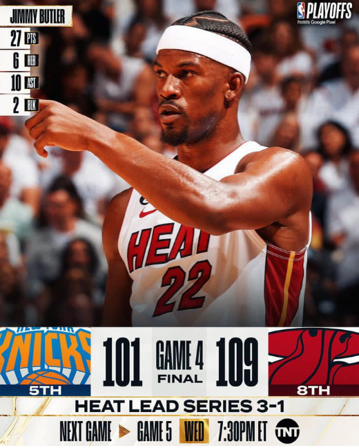 Em Miami, o Heat confirmou a vitória em seus dois jogos em casa. Mesmo com um “duplo-duplo” de Brunson pelos Knicks, no jogo 4, a noite inspirada de Butler e Adebayo foi o suficiente para o 3×1 na série se tornar realidade. Para quem foi o último a se classificar para os Playoffs, o time da Flórida quer ser o último a sair deste também.