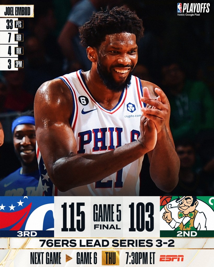 Em Boston, Embiid fez um jogo para chamar de seu. Destruindo o sistema defensivo imposto pelos Celtics, o MVP da temporada mostrou o porque foi eleito assim. Nem mesmo os quase 40 pontos de Tatum foram capazes de tirar a paz do Sixers na partida. Maxey fez seu melhor jogo na série. O resultado permite ao time da Filadélfia garantir seu lugar na Final jogando em casa. Os Celtics terão que mostrar sua força e vencer os próximos dois jogos, caso queira está na Final do Leste.