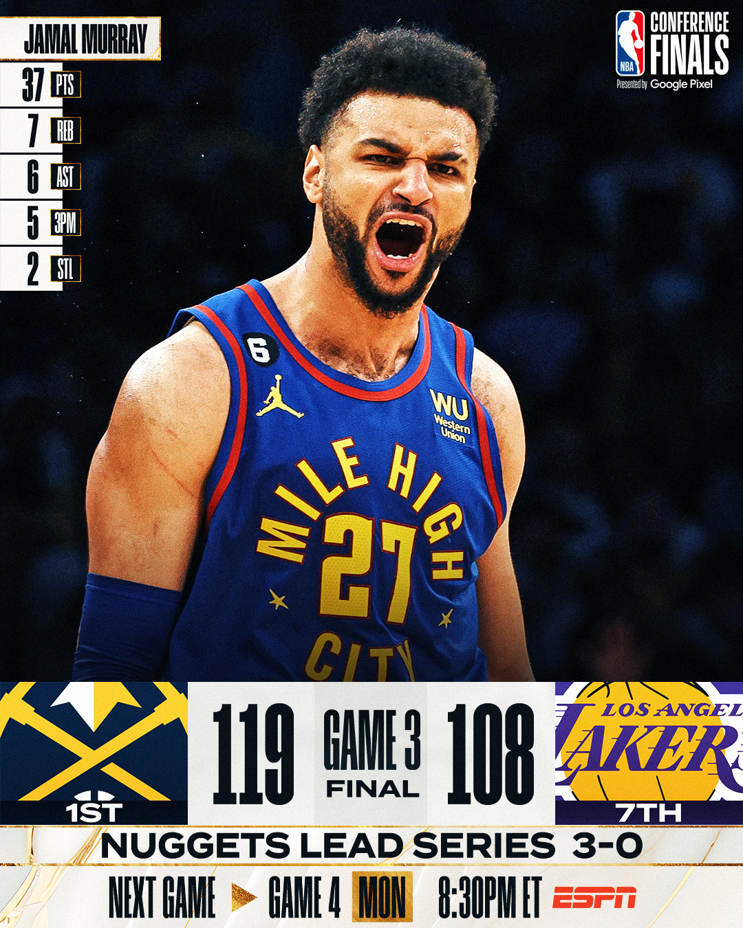 Com um outro quarto período mágico, os Nuggets conseguiram vencer novamente os Lakers nas Finais do Oeste da NBA. Com o primeiro triunfo fora de casa, o time de Denver fica a uma vitória, na próxima segunda-feira (22), de garantir pela primeira vez na história da franquia, o título da Conferência e um lugar nas Finais da Liga.