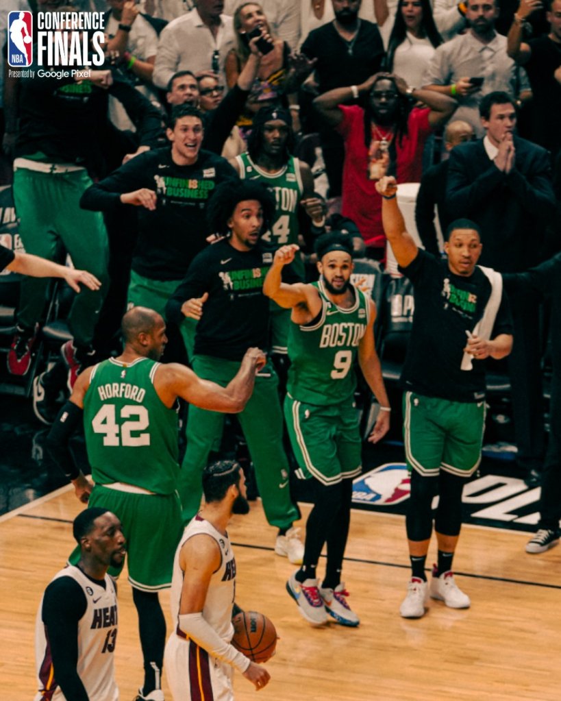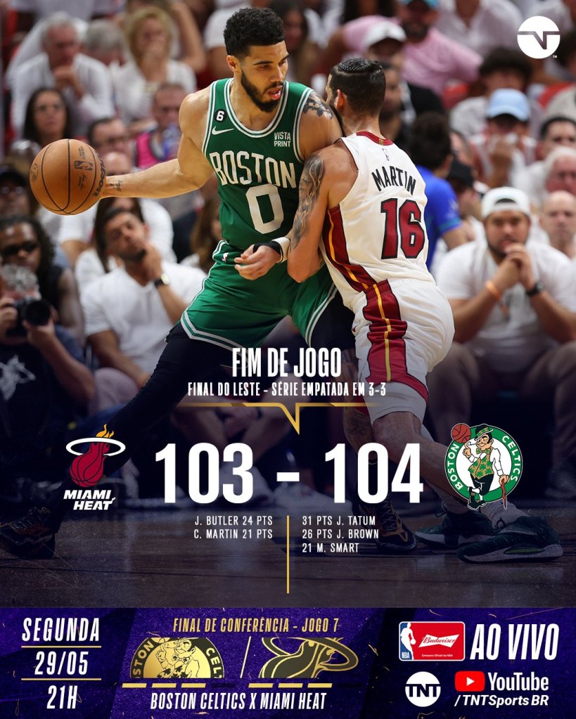 Em um resumo prático da partida até os dois minutos finais, o jogo foi bastante equilibrado, porém sempre com o Celtics a frente do marcador. Apenas duas vezes, o Miami Heat conseguiu ficar à frente, antes dos dois minutos finais da partida, sendo no início da partida e nos primeiros minutos do quarto período, no demais, só deu Celtics! Tatum e Brown fizeram um jogo absurdo, enquanto Butler estava sumido, deixando o protagonismo para os reservas como Martin, Vincent e Robinson. Adebayo, Smart, White, Horford e Robert Williams foram outros que aparecem bem até ali.
