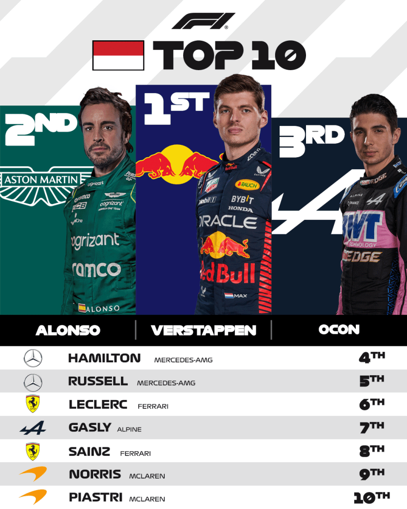 A chuva até tentou dar emoção a um GP conhecido pela falta de ultrapassagens , mas Monaco consagrou o dono da Fórmula 1 nas últimas temporadas, Max Verstappen. Sua maturidade foi fundamental para confirmar uma vitória tranquila e esperada. Alonso, outro que usou toda a experiência para conquistar o segundo lugar. Enquanto que Ocon soube segurar Hamilton e alcançar o pódio em sua “quase” casa. Pérez, que largou nas últimas posições, não conseguiu a arrancada e nem os pontos alcançou. Destaque para as Mercedes, que entendem sua limitação, e fazem a corrida sem correr riscos, mas pontuando, assim se aproximando da Aston Martin e se afastando da Ferrari na classificação.