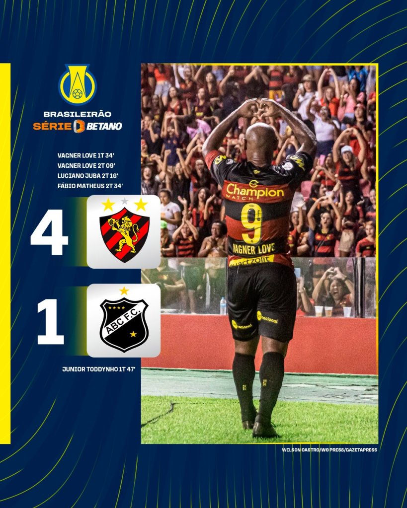 Na Ilha do Retiro, show de Vagner Love e goleada do Sport, que se aproxima do G4, sobre o ABC. Mesmo com dois jogos à menos, o Leão está à 3 pontos do G4, enquanto o alvinegro potiguar continua na lanterna.