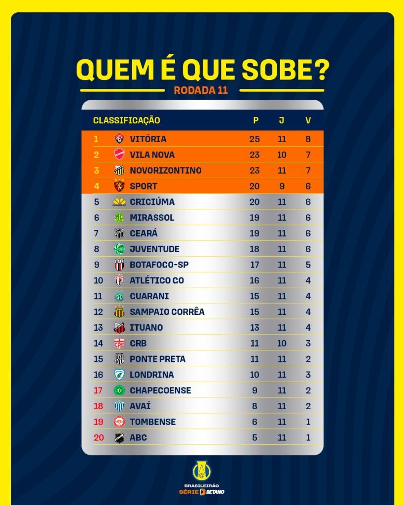 O Vitória segue líder! Contra a Tombense, em Muriaé, o rubro-negro apenas confirmou o óbvio. Vila Nova e Sport, os times com jogos à menos que estão no G-4, venceram de novo. Falando em vencer de novo, Novorizontino, Juventude e Ceará seguem arrancando depois de um início ruim. O CRB venceu a segunda seguida sobre o pessoal de cima e saiu do Z4. Avaí e Chapecoense seguem juntas no Rebaixamento.